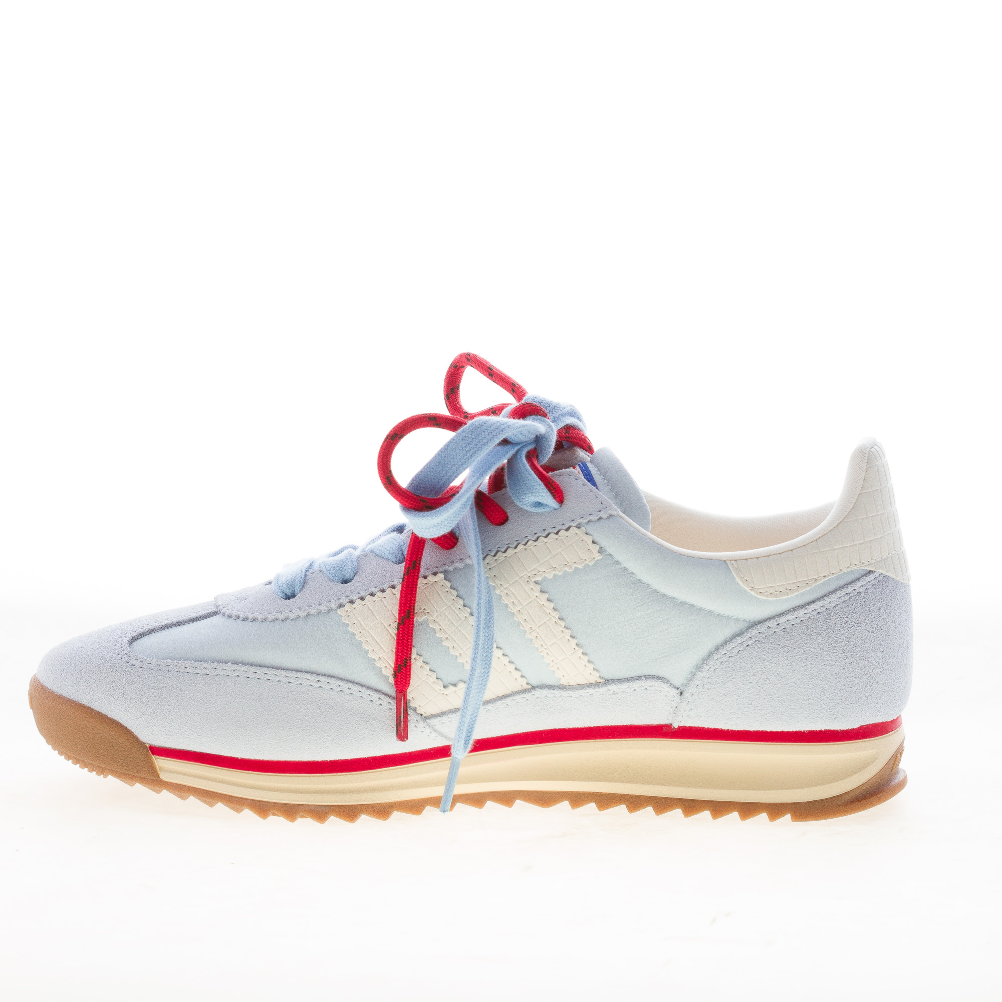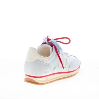 Jogger Spongy sneaker made in blue sky nylon fabric and suede with white croco-embossed leather logo 70 at side and back detail. New fashion detail with alternative contrasting cord. Removable footbed of 1,5 cm. Rubber sole with a 3 cm height at the heel.