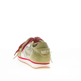 Sneaker Rocket realizzata in tessuto tecnico e camoscio verde oliva con logo 70 ai lati in pelle latte e talloncino cucito con logo. Nuovo dettaglio con laccio in cotone e cordoncino fashion a contrasto. Plantarino estraibile di 1,5 cm. Suola gomma con altezza di 2,5 cm al tacco