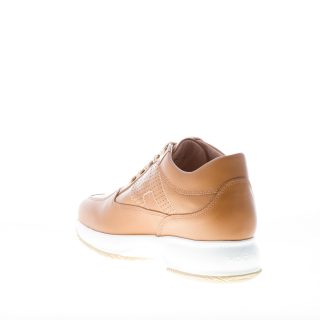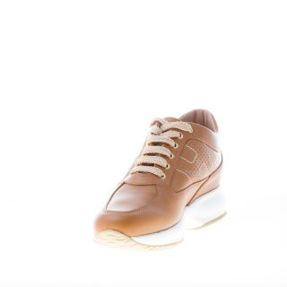 Sneaker Interactive realizzata in pelle colore cuoio naturale con monogramma Hogan cucito ai lati in pelle traforata. Fussbett estraibile interno di circa 2 cm. Suola in gomma rialzata per un’altezza totale di circa 5,7 cm