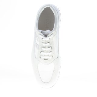 Interactive white suede sneaker with high-tech fabric panels. Hogan monogram on side with strass embellishment. Removable footbed 2 cm. Rubber sole