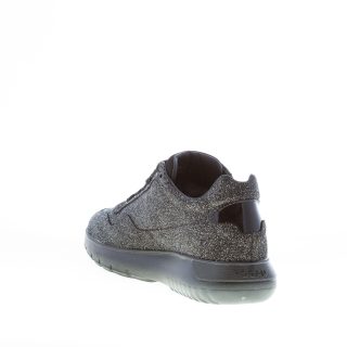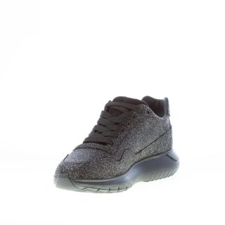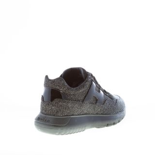 Sneaker Interactive Cube realizzata in pelle glitterata nera con sfumature argento. Monogramma Hogan a lato e dettaglio posteriore in vernice nera. Fussbett estraibile interno di 2 cm. Suola in gomma leggera