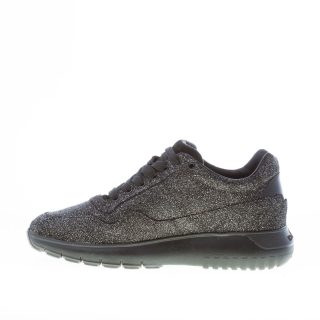 Interactive Cube black glittered leather sneaker with silver tone shades. Patent leather Hogan monogram on side and back detail. Removable footbed 2 cm. Lightweight rubber sole