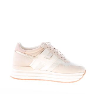 H483 (H222 Midi Platform) beige suede and lurex tech fabric sneaker with antique pink leather detail at back and platinum leather stitched Hogan monogram at sides. Gold leather details. Removable footbed 1 cm. White rubber platform sole 3,8 cm (1,5 inches) with piping detail