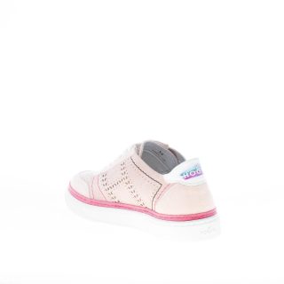 Sneaker H508 realizzata in camoscio rosa cipria con impunture colorate a contrasto e forature sulla tomaia. Monogramma Hogan a lato ottenuto con micro-forature laser. Talloncino in pelle bianca con logo colorato. Fussbett interno removibile di 2 cm. Dettaglio in nastro rosso. Suola in gomma bianca