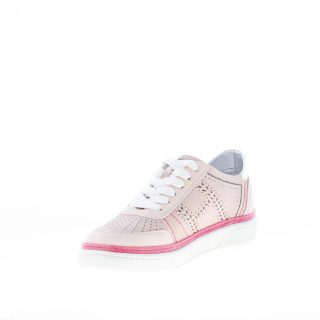 Light pink suede H508 sneaker with contrasting colored exposed stitchings and perforations throughout the vamp. Laser perforated Hogan monogram at sides. Removable internal footbed 2 cm. White leather heel counter with colored logo. Red tape detail. White rubber sole