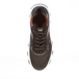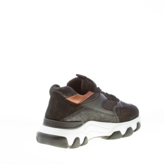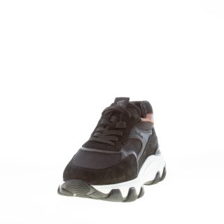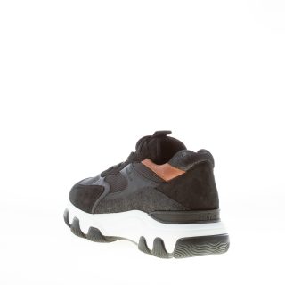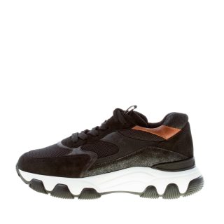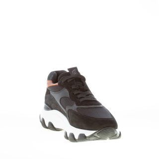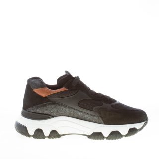 Hyperactive panelled sneaker featuring a mix of black suede and mesh tech fabric with black leather and tonal laminated suede details. Padded leather insert at back and at the ankle with a contrasting brown detail. Hogan logo engraved at side. Removable memory foam footbed 0,8 cm. White contrasting ultralight chuncky rubber sole. Total height 6 cm