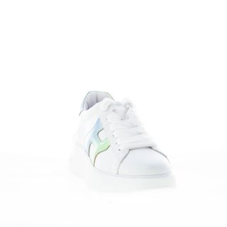 H564 Sneaker Rebel realizzata in morbida nappa colore latte con talloncino in pelle metallizzata cangiante verde. Monogramma Hogan ondulato a lato in pelle metallizzata cangiante verde-azzurro. Fussbett interno in memory foam di 0,8 cm. Suola in gomma leggera con scanalature celesti disegnate a mano. Altezza complessiva percepita di circa 5 cm