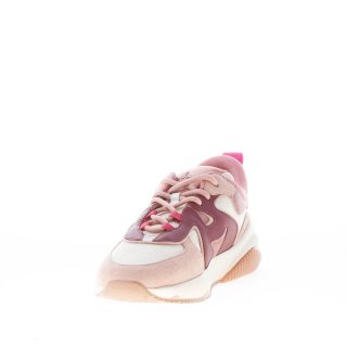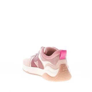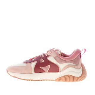 New Hogan H597 sneaker featured in pink suede and beige mesh tech fabric with wavy stitchings and dark pink leather wavy Hogan monogram at sides. Padded fabric insert at the ankle and tongue. Pull-up at the heel. Removable memory foam 0,8 cm footbed. Rubber sole. Height 3,5 cm