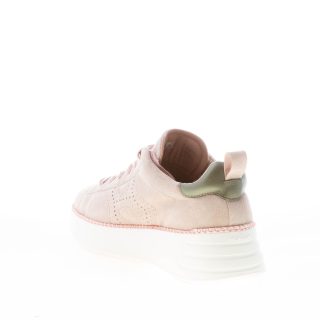 Beige suede Rebel sneaker with green metallic leather detail at back. Hogan monogram at sides with wavy perforations. Glamour pink fabric lacing with standard laces included in the packaging. Removable memory foam footbed 0,5 cm. Ultralight rubber sole. Total height 5 cm