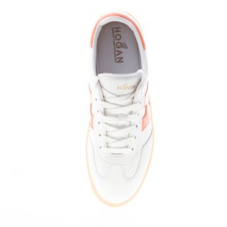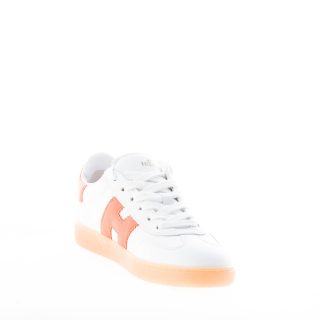 H647 white leather Hogan Cool sneaker with orange leather detail at back. Orange leather Hogan monogram at sides. Removable memory foam footbed 0,5 cm. Rubber sole. Total height 3,2 cm
