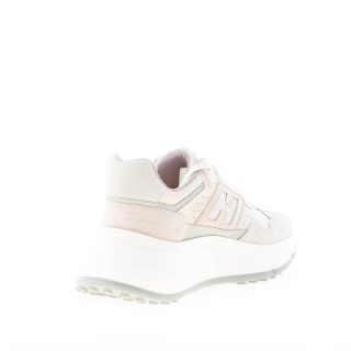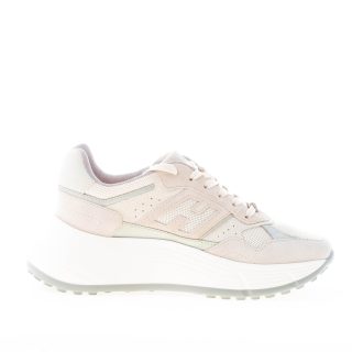 Sneaker Hogan H669 HI FI realizzata in camoscio e tessuto tecnico a rete beige e cipria con dettagli in pelle grigia. Largo monogramma Hogan intagliato ai lati e punzonature sulla tomaia. Fussbett interno in memory foam di 0,8 cm. Suola ispirata al modello Hyperlight con platform rialzato e altezza totale di 6,5 cm