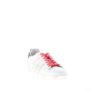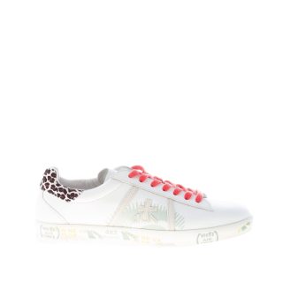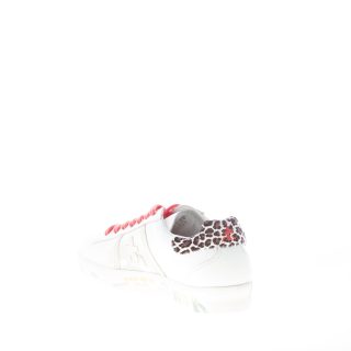 White leather Andy 5427 sneaker with a leopard print fabric insert at back. Iconic leather logo at sides with the porcupine print. Rubber sole with the typical prints of the brand