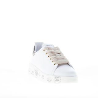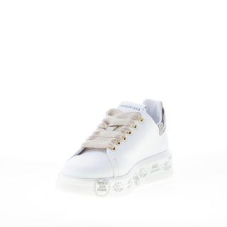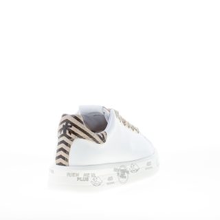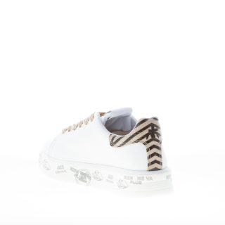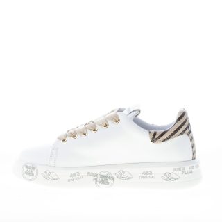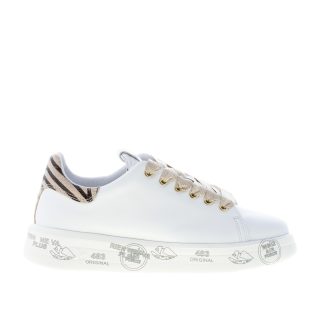 Sneaker BELLE 5716 realizzata in morbida pelle bianca. Inserto a contrasto beige zebrato con logo sul tallone. Suola a cassetta platform bianca di 3,5 cm in micro ultra-leggera con stampe graffiti