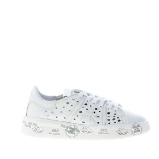 Sneaker Premiata BELLE 5722 realizzata in morbida pelle bianca sfoderata e traforata. Inserto in pelle bianca con logo sul tallone. Suola a cassetta platform bianca di 3,5 cm in micro ultra-leggera con stampe graffiti