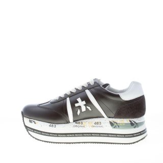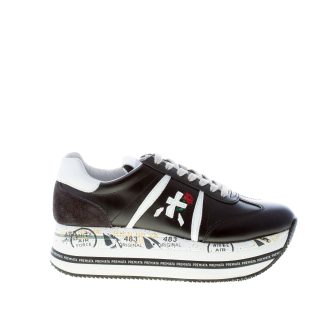 Sneaker Beth 5351 realizzata in pelle nera con l’iconica applicazione logo ai lati in pelle bianca decorata da una rosa rossa. Talloncino in pelle bianca a contrasto. Fussbett interno removibile di circa 1 cm. Suola maxi platform in gomma bianca ultra-light con le serigrafie e stampe tipiche del brand. Tacco 5 cm e platform 4 cm