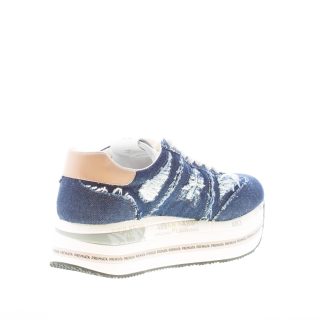 Blue denim Beth 6714 sneaker with vintage detailing throughout. Brown leather detail at back and iconic logo at sides. Internal removable footbed 1 cm. Ultra-light contrasting white platform rubber sole with the typical prints and a serigraphy of the brand. Heel 5 cm and platform 4 cm