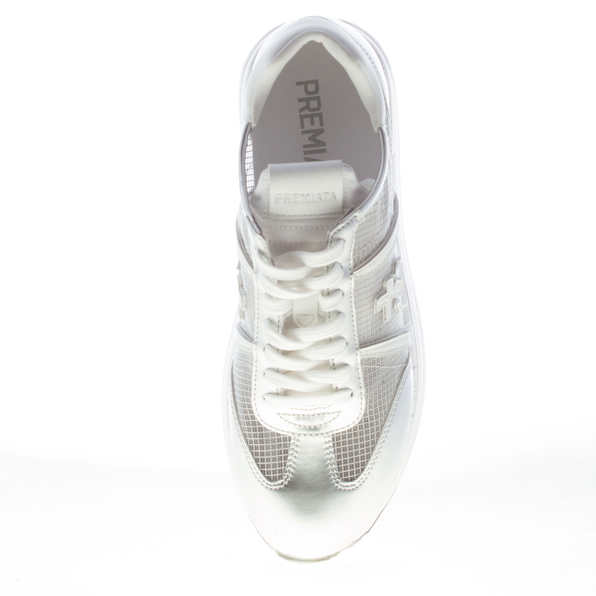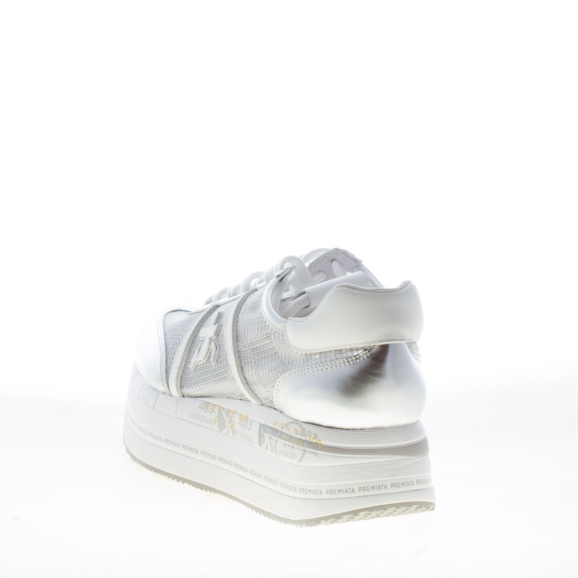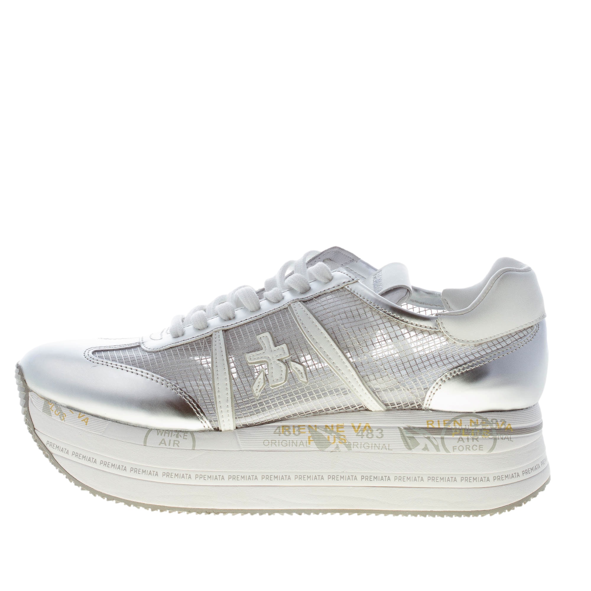 Silver metallic effect leather and transparent mesh tech fabric Beth 7373 sneaker. White leather detail at back and iconic logo at sides. Internal removable footbed 1 cm. Ultra-light contrasting white platform rubber sole with the typical prints and a serigraphy of the brand. Heel 5 cm and platform 4 cm