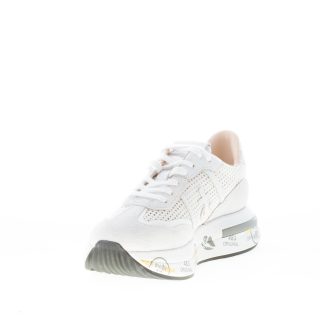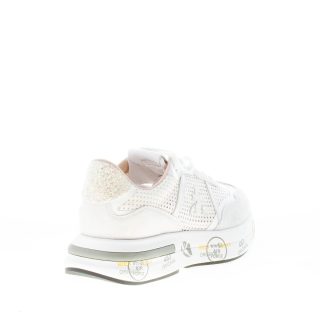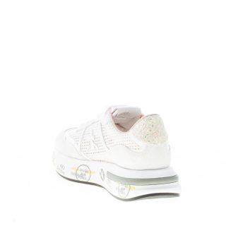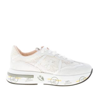 White suede and perforated fabric Cassie 6341 sneaker with white leather details. Iconic logo at sides. Glittered detail at back. Raised 4 cm ultra-light rubber sole with the typical prints of the brand