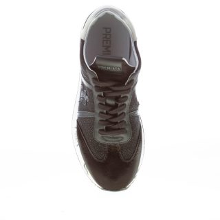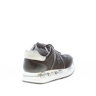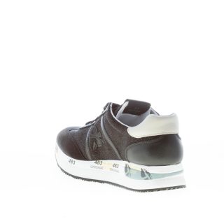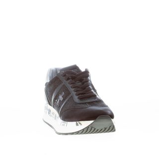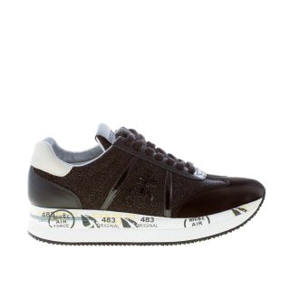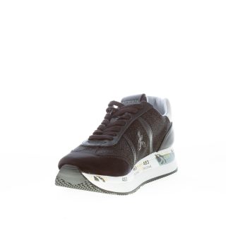 Black leather Conny 5329 sneaker with microglitter printed panels and grey leather detail at back. Side iconic brand logo. Removable internal footbed 1 cm. Raised rubber sole 4 cm with the typical prints of the brand