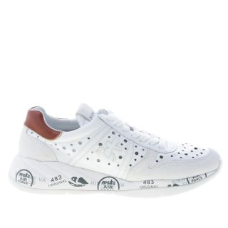 Layla 5217 sneaker in white suede and perforated leather. Tobacco leather detail at back. Removable internal footbed 1 cm. Raised rubber sole 4 cm with the typical prints of the brand