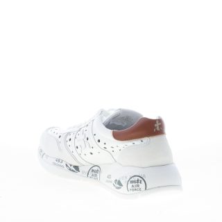 Sneaker Layla 5217 realizzata in pelle perforata e camoscio bianco. Dettaglio a contrasto con talloncino in pelle tabacco. Soletta estraibile di 1 cm. Suola in gomma rialzata di 4 cm con le tipiche stampe del brand