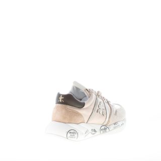 Sneaker Layla 5411 realizzata in camoscio e tessuto nylon beige con inserti glamour in pelle a stampa pitone marrone. Dettaglio a contrasto con talloncino in pelle nera. Soletta estraibile di 1 cm. Suola in gomma rialzata di 4 cm con le tipiche stampe del brand