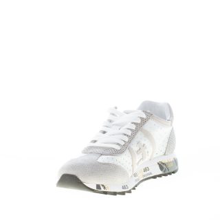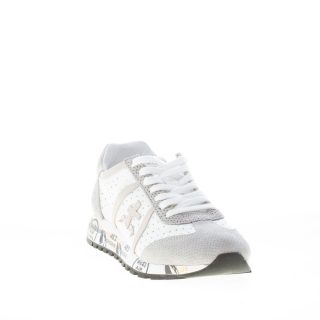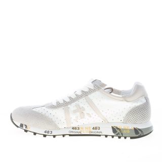 White perforated tech fabric and grey suede Lucy 5627 sneaker with pale grey leather detail at back and brand logo at sides. Rubber sole with the iconic printings of the brand