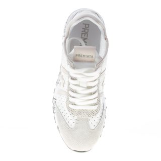 Sneaker Lucy 5627 realizzata in tessuto traforato bianco e camoscio con punzonature grigio. Dettagli in pelle grigia al tallone. Brand logo a lato in pelle. Suola in gomma con le iconiche stampe del brand