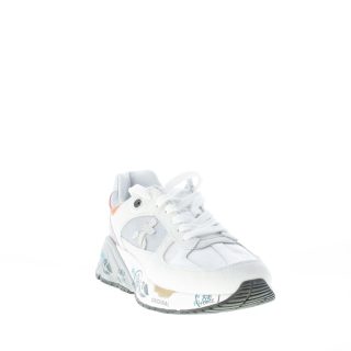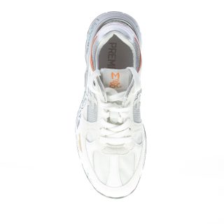 White suede and leather and silver tech fabric Mase 5664 sneaker with orange and purple suede details. Green rubber spoiler at the heel. Elevated rubber sole 4 cm with the iconic graffiti prints