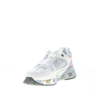 Sneaker MASE 5664 realizzata in un mix di camoscio e pelle bianca e tessuto tecnico argento con inserti in camoscio viola e arancione. Logo laterale. Spoiler in gomma verde con brand al tallone. Suola rialzata in gomma ed evo di circa 4 cm con le tipiche stampe graffiti
