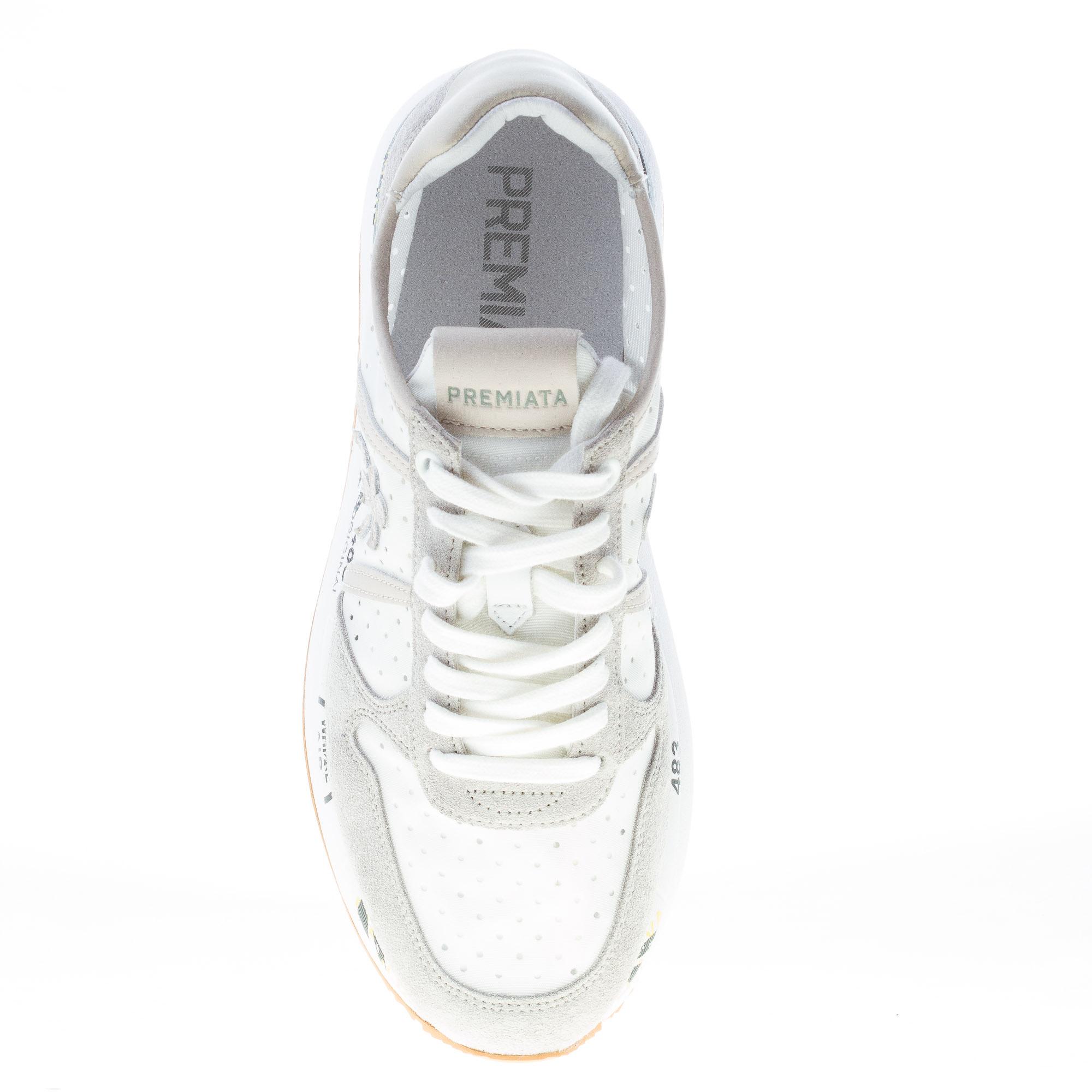 Sneaker Premiata Tris 5737 realizzata in camoscio grigio e tessuto nylon perforato bianco. Dettaglio a contrasto con talloncino in pelle grigia. Soletta estraibile di 1 cm. Suola in gomma rialzata di 3 cm con le tipiche stampe del brand