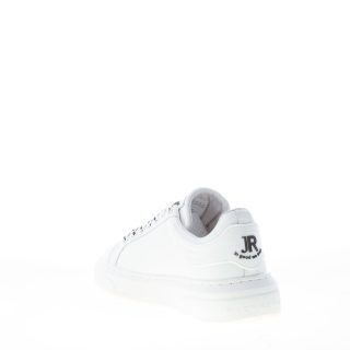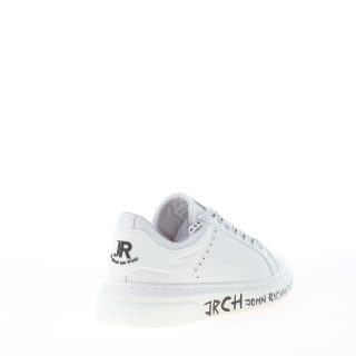 Sneaker John Richmond realizzata in pelle bianca con allacciatura a stampa brand nera a contrasto e spoiler logo al tallone in gomma nero con scritta “in good we trust”. Dettaglio con logo lettering nero su un lato della suola. Fussbett interno estraibile. Suola in gomma bianca con altezza di circa 3,5 cm