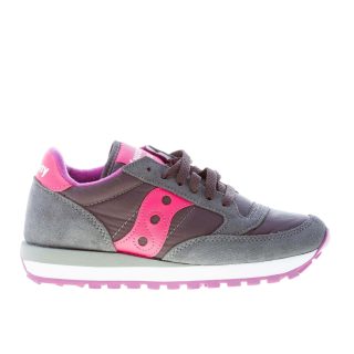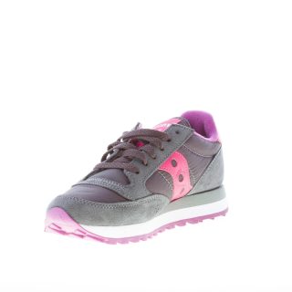 Sneaker donna Jazz Original in tessuto e camoscio grigio scuro più dettagli in pelle rosa. Stampa brand sul tallone e sulla linguetta. Suola in gomma leggera multicolore