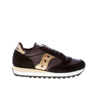 Sneaker donna Jazz Original in tessuto e camoscio nero più dettagli in pelle oro. Stampa brand sul tallone e sulla linguetta. Suola in gomma leggera multicolore