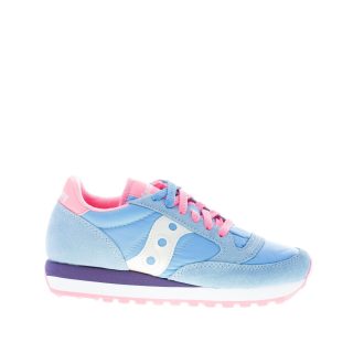 Sneaker donna Jazz Original in tessuto nylon e camoscio azzurro più dettagli rosa. Stampa brand sul tallone e sulla linguetta. Suola in gomma leggera multicolore.