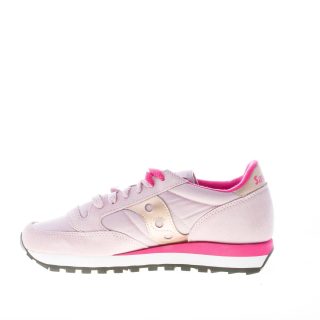 Sneaker donna Jazz Original in tessuto nylon e camoscio rosa con dettagli in pelle oro. Stampa brand sul tallone e sulla linguetta. Suola in gomma leggera multicolore.
