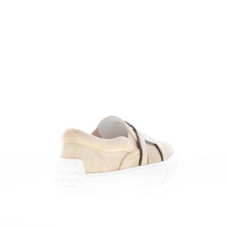 Beige velvety suede Kate slip-on sneaker embellished with the iconic brand Kate chain detail at front . Reinforced white rubber heel detail with exposed “gommini” and logo. Cassetta rubber sole