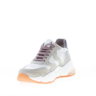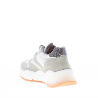 Sneaker Sheel realizzata in camoscio e tessuto nylon grigio con talloncino glitter. Suola in gomma e Eva ultra leggera rialzata con inserto trasparente
