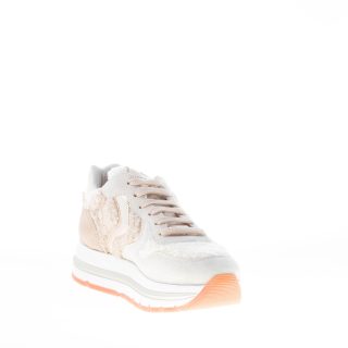 Sneaker Maran realizzata in camoscio ghiaccio e beige con pannelli in pelliccia sintetica beige e bianchi. Dettagli in pelle metallizzata oro con logo sulla linguetta e sul tallone. Suola in Eva e gomma leggera rialzata
