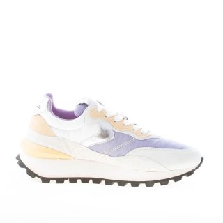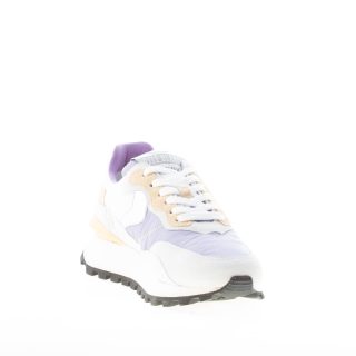 Sneaker Qwark Hype realizzata in un mix di tessuto nylon bianco e lilla con inserti in camoscio grigio e senape. Talloncino in pelle argento e spoiler in gomma senape con logo al tallone. Suola in gomma leggera rialzata con battistrada dentellato