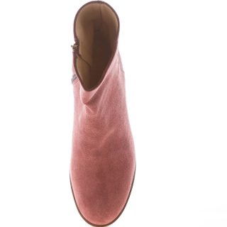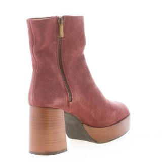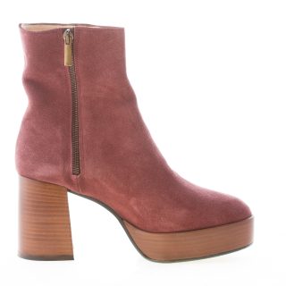 Tronchetto in camoscio vinaccia con punta rotonda e chiusura con zip sul lato interno. Made in Italy. Platform in cuoio di 3 cm. Suola in gomma. Tacco in cuoio di 9 cm