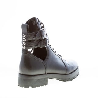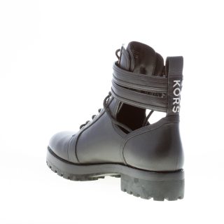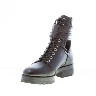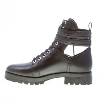 Black leather Bensen combat bootie with laces closure and two straps with silver metal adjustable buckles. Open on sides. Silver metal logo detail at back. Heel 4 cm. Rubber lug outsole
