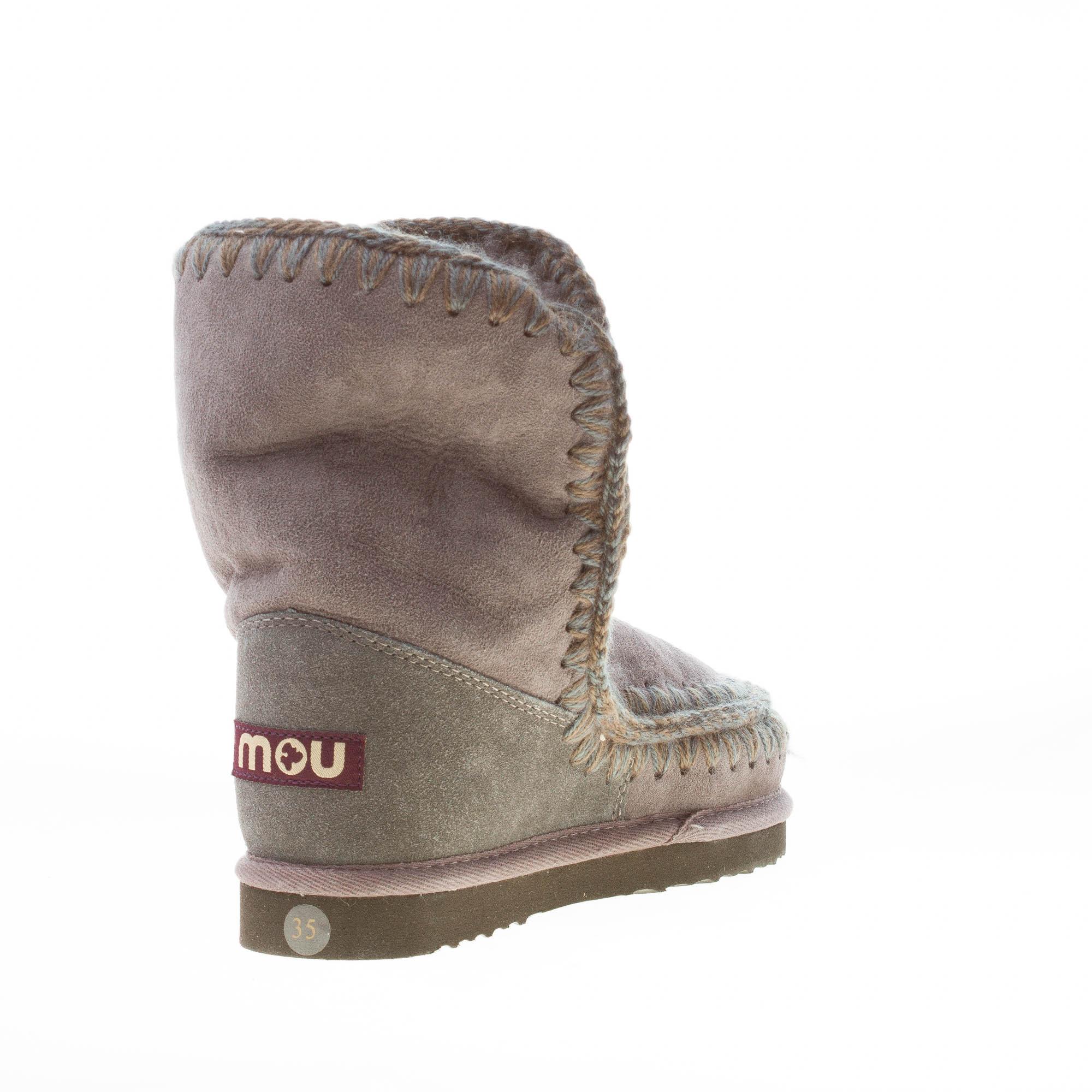 Stivaletto Eskimo Boot 24 realizzato in montone double face colore grigio scuro. Cuciture in lana lavorate all’uncinetto.Targhetta in metallo con logo al tallone. Suola leggera in gomma e Eva di 3 cm