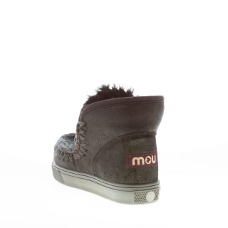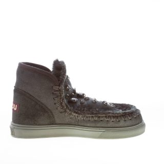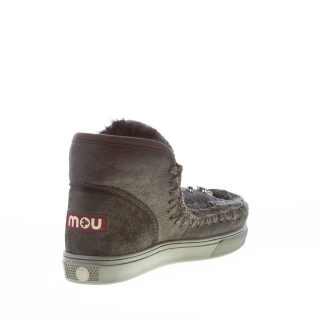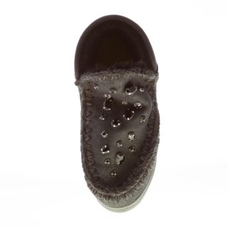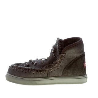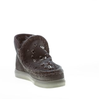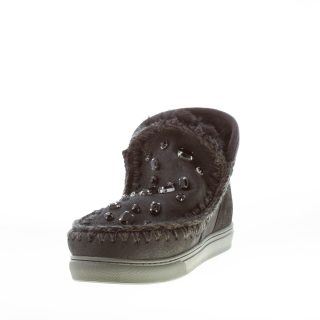 Black double-face shipskeen Mini Eskimo Sneaker ankle boot with rhinestones embellishment. Shaft height 13 cm. Handmade wool stitchings. Sneaker style rubber outsole with approximately 4 cm height at the heel