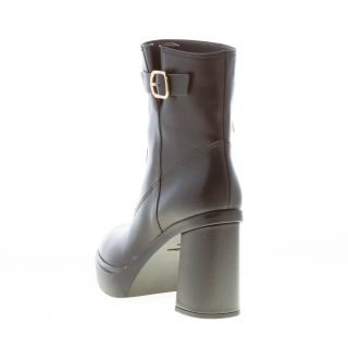 Black fine leather Santoni ankle boot with a plain round toe and a zip fastening on the internal side. Decorative gold-tone buckle with strap. Exposed stitchings on the vamp. Rubber platform 2 cm. Rubber sole. Heel 8,5 cm