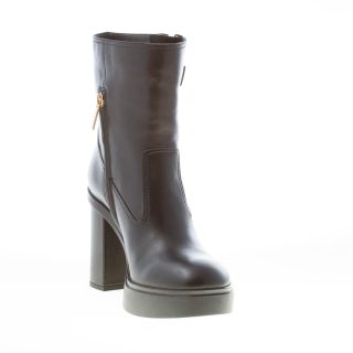 Stivaletto Santoni in pregiata pelle nera con punta liscia rotonda e platform in gomma di circa 2 cm. Chiusura con zip sul lato interno e cinturino con fibbia decorativa in metallo dorato. Cuciture in rilievo sulla tomaia. Suola in gomma. Tacco largo di circa 8,5 cm