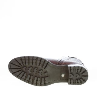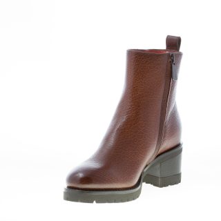 Stivaletto in pelle martellata marrone con punta liscia. Chiusura con zip sul lato interno. Suola in gomma con dettaglio