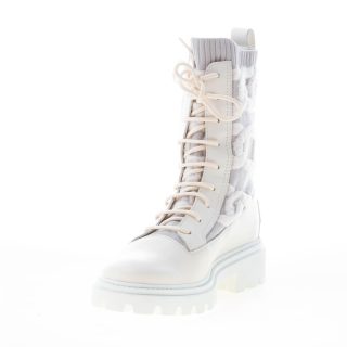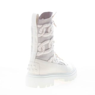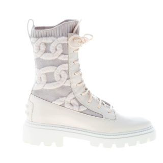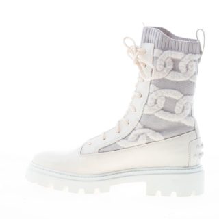 Kate laced combat boot made in white leather with an elasticized knit fabric insert decorated with a chains motif. Heel 3 cm. Rubber outsole with lug detailing.