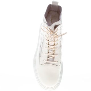 Anfibio stringato Kate realizzato in pelle bianca con inserto in tessuto a maglia elasticizzato e decorato da motivo a catena. Dettaglio con applicazione di gommini al tallone. Tacco 3 cm circa. Suola in gomma con dettaglio carrarmato