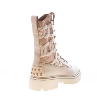 Anfibio stringato Kate realizzato in pelle beige naturale scuro con inserto in tessuto a maglia elasticizzato e decorato da motivo a catena. Dettaglio con applicazione di gommini al tallone. Tacco 3 cm circa. Suola in gomma con dettaglio carrarmato